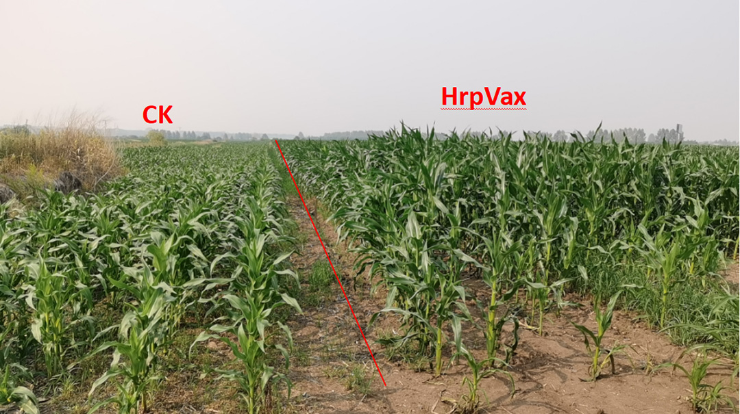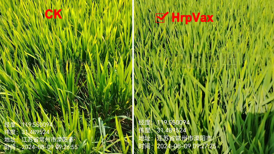 Rice seedlings sprayed with HrpVax protein show robust growth, multiple tillers, and almost no dry tip and yellow leaf phenomena.