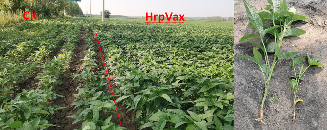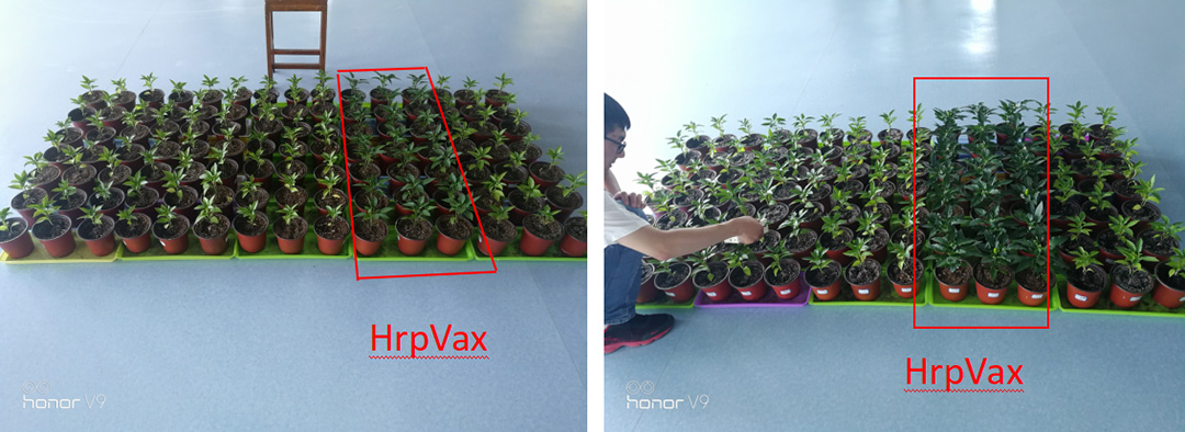 Spraying + root irrigation with HrpVax protein,pepper plants were robust, thick green leaves, early flowering and fruit.