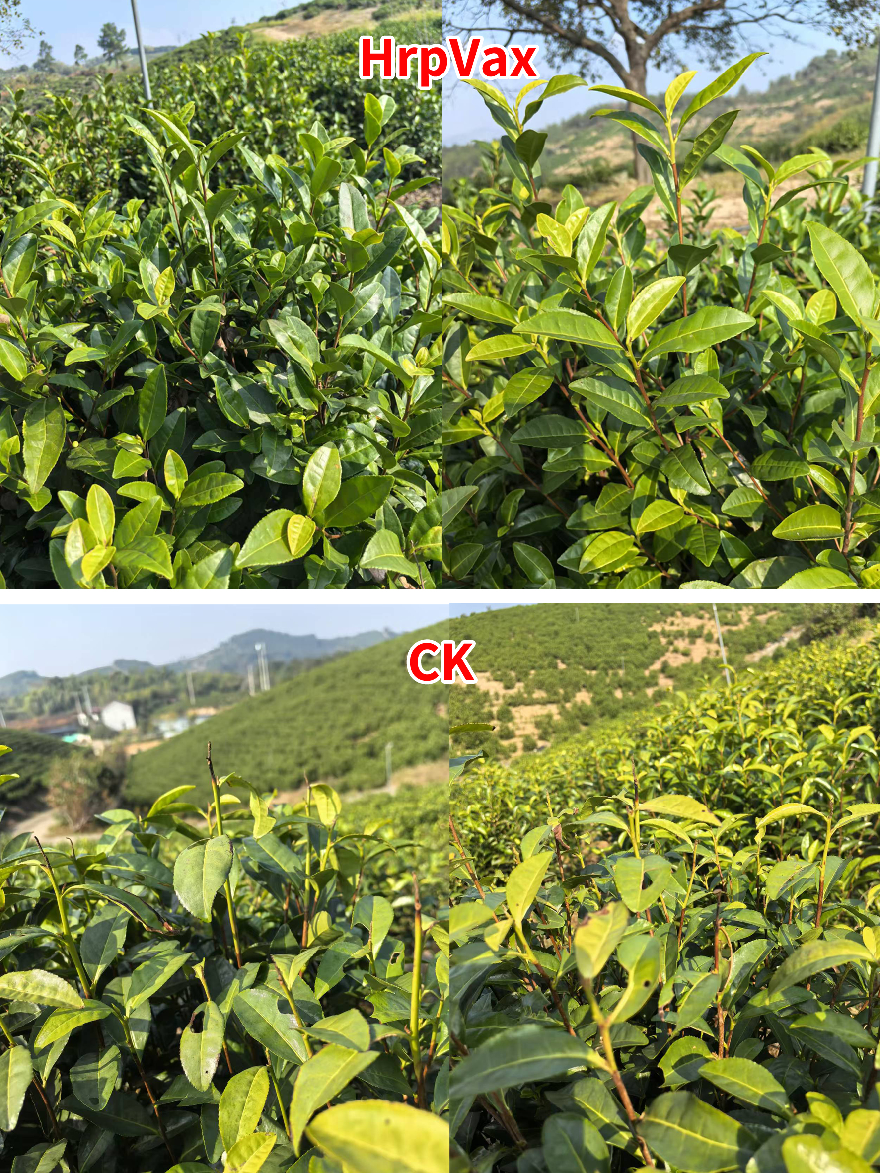 After spraying HrpVax, the leaves of tea trees were bright and the new shoots grew well, and there was no shoot dead phenomenon.